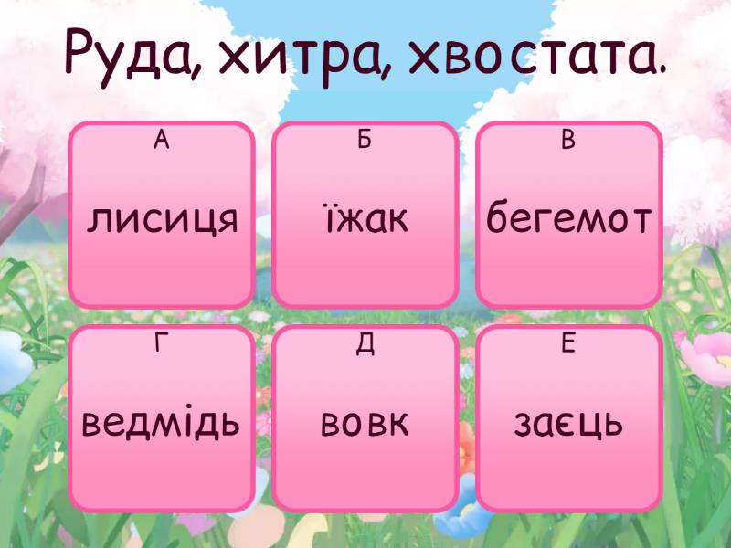 1) Руда, хитра, хвостата. a) лисиця b) їжак c) бегемот d) ведмідь e) вовк f) заєць 2) Сірий, колючий, безхвостий, маленький, хижий a) вовк b) голка c) ялинка d) їжак e) крокодил f) медуза 3) Смачне, солодке, холодне, вершкове, шоколадне. a) Торт b) курка c) морозиво d) цукерка e) гуска f) картопля 4) Маленька, кругленька, червоненька, солоденька, запашна. a) полуниця b) кавун c) груша d) помідор e) калина f) чорниця 5) Жовтий, кислий, корисний, вітамінний a) кавун b) черешня c) апельсин d) диня e) лимон f) вишня 6) Довговухий, прудконогий, полохливий a) вовк b) ведмідь c) бегемот d) єнот e) пантера f) заєць 7) Вусатий, грайливий, хвостатий, м'який, когтистий a) песик b) котик c) лисиця d) пантера e) тигр f) панда 8) Сірий, товстоногий, вухастий, величезний a) корова b) кінь c) слон d) миша e) свиня f) віслюк 9) Пахуча, колюча, квітуча, пишна, ніжна, ароматна a) мак b) кульбабка c) соняшник d) тюльпан e) троянда f) лілія 10) Письмовий, кухонний, дерев’яний, чотириногий, накритий a) диван b) крісло c) тумба d) шафа e) стілець f) стіл 11) Місячна, прохолодна, темна, зоряна, тиха a) сонце b) зірки c) туман d) дощ e) ніч f) веселка 12) Довга, сталева, гостроноса, тоненька, швейна a) голка b) їжак c) ручка d) ножиці e) ніж f) праска