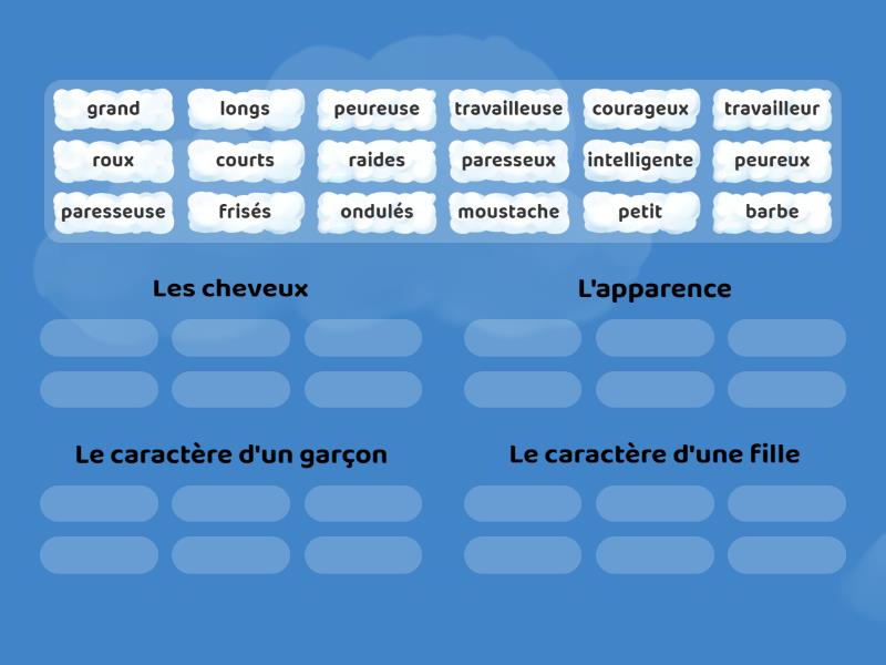 Les cheveux: ondulés, raides, roux, longs, courts, frisés, L'apparence : barbe, moustache, petit, grand, Le caractère d'un garçon: peureux, courageux, travailleur, paresseux, Le caractère d'une fille: peureuse, intelligente, travailleuse, paresseuse,