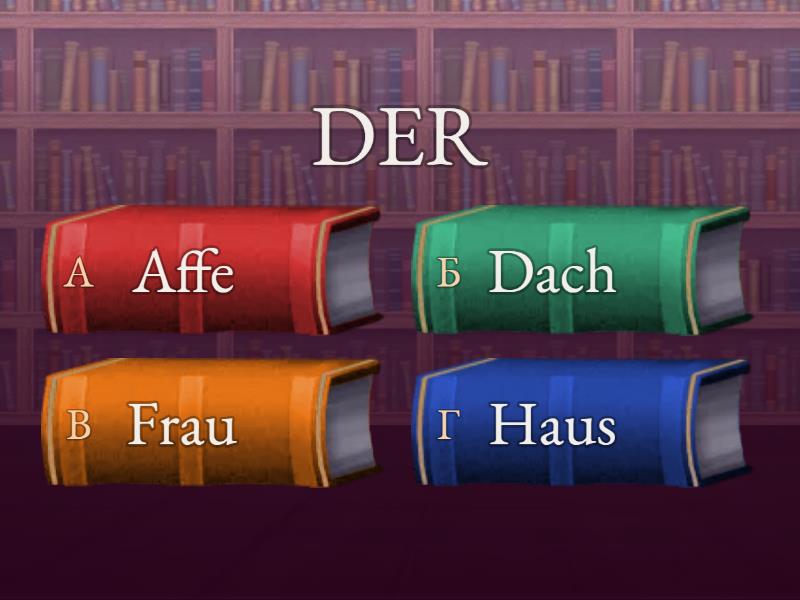 1) DER a) Affe b) Dach c) Frau d) Haus 2) 365 Tagen a) die Uhr b) der Tag c) das Jahr d) das Leben 3) Prüfung a) der b) die c) das 4) der Vogel a) Єнот b) Скунс c) Птах d) Змій 5) Яхта a) die Yacht b) das Yaht c) der Yascht d) die Yachta 6) die Quelle a) b) 7) rot + rund a) b) 8) die Wärme a) черв'як b) тепло c) ворс d) війна 9) tanzen + singen a) b) 10) der Zug a) b) 11) stehen + sagen a) b) 12) die Liste a) список b) листок c) лазня d) ластовиння 13) Auf der Bank sitzen a) b) c) d) 14) keine Lust haben a) b) 15) der Satz a) Wo bist du? b) Nein c) Ich komme aus der Ukraine. d) Ähm...
