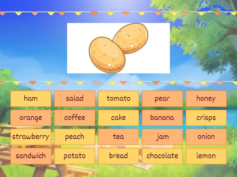 potato, pear, tomato, onion, lemon, orange, peach , banana, strawberry, sandwich , bread, salad, ham, jam, cake, honey , crisps , tea , chocolate , coffee,
