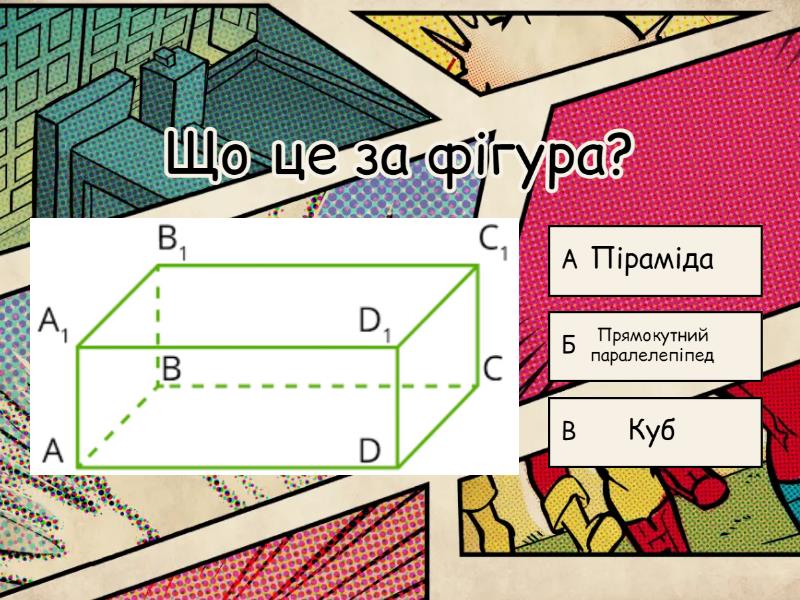 1) Що це за фігура? a) Піраміда b) Прямокутний паралелепіпед c) Куб 2) Прямокутний паралелепіпед має: a) 8 вершин, 12 ребер, 6 граней b) 5 вершин, 10 ребер, 3 грані c) 100 вершин, 15 ребер, 8 граней 3) Зазнач формулу для обчислення об'єму. a) V=a+b+c b) V=3*a*b*c c) V=a*b*c 4) Обчисли об'єм прямокутного паралелепіпеда з вимірами 3 см, 2 см, 5 см a) 10 см3 b) 30 см3 c) 24 см3 5) Яке ребро дорівнює ребру В1С1 ? a) АD b) A1A
