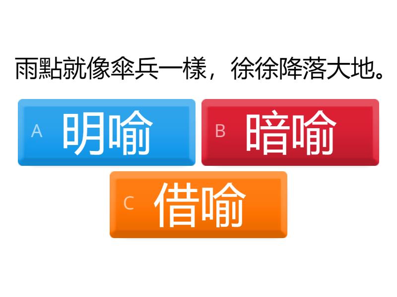 1) 雨點就像傘兵一樣,徐徐降落大地。 a) 明喻 b) 暗喻 c) 借喻 2) 經過警方的盤問,他的狐狸尾巴終於露出來了。 a) 明喻 b) 暗喻 c) 借喻 3) 馬路如虎口,大家要小心過馬路。 a) 明喻 b) 暗喻 c) 借喻 4) 漫長的人生宛如在寬廣的麥田中前行。 a) 明喻 b) 暗喻 c) 借喻 5) 老師是人生路上的燈,給我們照亮前面的路。 a) 明喻 b) 暗喻 c) 借喻 6) 公路上發生了交通意外,車輛排列成一條長長的巨龍。 a) 明喻 b) 暗喻 c) 借喻 7) 哥哥已放下去年表現失準的包袱,決心再參加校際朗誦比賽。 a) 明喻 b) 暗喻 c) 借喻 8) 彎彎的月亮是一葉輕舟,在銀河裏隨波盪漾。 a) 明喻 b) 喑喻 c) 借喻 9) 榕樹的鬍子隨風飄盪,人們在樹下乘涼,度過悠閒的下午。 a) 明喻 b) 暗喻 c) 借喻 10) 大雪過後,樹上、屋頂上、汽車上都蓋上了鬆軟的白棉被。 a) 明喻 b) 暗喻 c) 借喻 11) 突如其來的閃電變成了一把明亮閃爍的刀子,劃破漆黑的夜空。 a) 明喻 b) 暗喻 c) 借喻