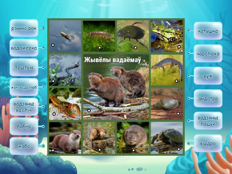 бабёр, вадамерка, вадзяны вослік, жук-вадалюб, жаба, трытон, катушка, чарапаха, вадзяны пацук, андатра, выдра, рэчны рак, вуж.