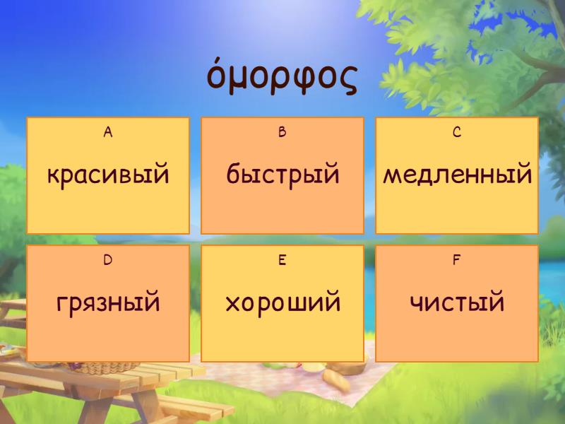 1) όμορφος a) красивый b) быстрый c) медленный d) грязный e) хороший f) чистый 2) καλός a) дорогой b) медленный c) хороший d) тёмный e) быстрый f) внимательный 3) κακός a) плохой b) правильный c) быстрый d) интересный e) скучный f) грустный 4) δύσκολος a) трудный b) весёлый c) плохой d) светлый e) лёгкий f) тёмный 5) εύκολος/ελαφρύς a) медленный b) скучный c) дорогой d) лёгкий e) активный f) весёлый 6) χαρούμενος a) весёлый b) грустный c) внимательный d) медленный e) интересный f) скучный 7) λυπημένος a) грустный b) дорогой c) грязный d) тёмный e) скучный f) светлый 8) βαρετός a) хороший b) трудный c) светлый d) скучный e) правильный f) интересный 9) ενδιαφέρων a) медленный b) интересный c) скучный d) чистый e) весёлый f) грязный 10) σκούρος/σκοτεινός a) тёмный b) скучный c) пассивный d) трудный e) светлый f) весёлый 11) ανοιχτός/φωτεινός a) грустный b) дорогой c) красивый d) светлый e) тёмный f) весёлый 12) νόστιμος a) грустный b) правильный c) активный d) вкусный e) весёлый f) вимательный 13) καθαρός a) внимательный b) быстрый c) чистый d) плохой e) трудный f) медленный 14) βρώμικος a) грустный b) дешёвый c) грязный d) пассивный e) быстрый f) чистый 15) ακριβός a) дорогой b) плохой c) вкусный d) лёгкий e) дешёвый f) весёлый 16) φτηνός a) дешёвый b) скучный c) вкусный d) чистый e) дорогой f) грязный 17) γρήγορος a) хороший b) весёлый c) быстрый d) дешёвый e) активный f) медленный 18) αργός a) красивый b) трудный c) медленный d) грустный e) быстрый f) правильный 19) ενεργητικός a) весёлый b) тёмный c) активный d) грязный e) пассивный f) быстрый 20) παθητικός a) грустный b) скучный c) пассивный d) внимательный e) плохой f) дешёвый 21) προσεκτικός a) дорогой b) грустный c) внимательный d) скучный e) правильный f) хороший 22) σωστός a) правильный b) вкусный c) дешёвый d) медленный e) внимательный f) хороший