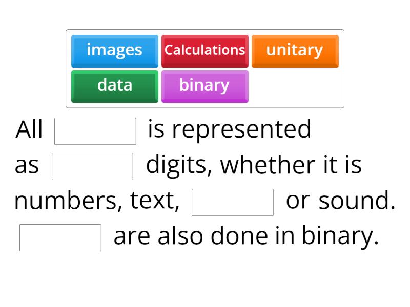 All ____ is represented as ____ digits, whether it is numbers, text, ____ or sound. ____ are also done in binary. In a computer, all data is stored in ____ form. A binary digit has ____ possible states, 1 and 0.A binary ____ is known as a ____. A bit is the ____ unit of data a computer can use. The binary unit system is used to describe ____ numbers too. ____ bits are known as a ____. ____ bits or ____ a byte is known as a nibble. ____ data is a real-life signal that can vary greatly in value. Examples include:- ____ waves - ____ - ____ ____ data is ____ data which represents analogue data. ____ work with digital data. Analogue data must be ____ to digital before a computer can use it. A device known as an ____ convertor (ADC) is used to generate digital data from analogue signals. In the same way, a digital signal can be converted ____ to an analogue signal using a digital-to-analogue convertor ____. ____ tend to use the ____ number system. However, computers work in ____. Denary numbers must be ____ into their binary equivalent before a ____ can use them. The ____ system has ____ digits (0, 1, 2, 3, 4, 5, 6, 7, 8 and 9). Each denary ____ value is calculated by ____ the previous place value by ten. For example:10,000 1,000 100 10 1 ____ has just two units, ____ and ____. The value of each binary place value is calculated by ____ the previous place value by ____. The first ____ binary place values are: 128 64 32 16 8 4 2 1 In ____, each place value can only be represented by ____ or a ____.To convert binary to ____, simply take each place value that has a 1, and ____ them together. Example - binary number 1111100 Result: (0 × 128) + (1 × 64) + (1 × 32) + (1 × 16) + (1 × 8) + (1 × 4) + (0 × 2) + (0 × 1) = 124 What would these binary numbers be in denary?- 1001 = ____ - 10101 = ____ - 11001100 = ____ To convert from ____ to binary, start by ____ the ____ place value you can from the denary number, then place a 1 in that place value column. Next, ____ the ____ biggest place value you can, and place a ____ in the column. Repeat this process until you reach ____. Finally, place a ____ in any empty place value columns. Example - ____ number 84First set up the columns of ____ place values. 128 64 32 16 8 4 2 1 ____ is the biggest place value that can be ____ from 84. Place a ____ in the 64 place value column and subtract 64 from 84, which gives ____. 16 is the biggest place value that can be subtracted from 20. Place a 1 in the ____ place value column and subtract 16 from 20, which gives ____. 4 is the biggest place value that can be subtracted from 4. Place a 1 in the 4 place value column and subtract 4 from 4, which gives ____. Place a 0 in each remaining ____ place value column. Result: 84 in denary is 1010100 in binary. To check that this is right, convert the ____ back to ____: (0 × 128) + (1 × 64) + (0 × 32) + (1 × 16) + (0 × 8) + (1 × 4) + (0 × 2) + (0 × 1) = 84 Another way to ____ a denary number to binary is to ____ the starting number by two. If it divides ____, the binary digit is 0. If it does not and there is a ____, the binary digit is ____. Finally, ____ the digits and you have the correct number. What would these denary numbers be in binary?- 12 = ____ - 42 = ____ - 188 = ____ When two numbers are added together in ____, we take the first number, ____ the second number to it, and get an answer. For example, 1 + 2 = ____. When we add two ____ numbers together the process is ____. There are ____ rules that need to be followed when adding two ____ numbers. These are:1) 0 + 0 = 0 2) 1 + 0 = 1 3) 1 + 1 = 10 (binary for denary ____ 4) 1 + 1 + 1 = 11 (binary for denary ____