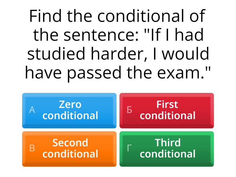 1) Find the conditional of the sentence: "If I had studied harder, I would have passed the exam." a) Zero conditional b) First conditional c) Second conditional d) Third conditional 2) Find the conditional of the sentence:"If you heat water to 100 degrees Celsius, it boils." a) Zero conditional b) First conditional c) Second conditional d) Third conditional 3) Find the conditional of the sentence:"If it rains tomorrow, I will stay at home." a) Zero conditional b) First conditional c) Second conditional d) Third conditional 4) Find the conditional of the sentence:"If I won the lottery, I would buy a house by the beach." a) Zero conditional b) First conditional c) Second conditional d) Third conditional 5) Find the conditional of the sentence:"If I won the lottery, I would travel around the world." a) Zero conditional b) First conditional c) Second conditional d) Third conditional 6) Find the conditional of the sentence:"If it doesn't rain tomorrow, we'll go to the beach." a) Zero conditional b) First conditional c) Second conditional d) Third conditional 7) Find the conditional of the sentence:"If I drink too much coffee, I can't sleep at night." a) Zero conditional b) First conditional c) Second conditional d) Third conditional 8) Find the conditional of the sentence:"If I hadn't eaten so much, I wouldn't have felt sick. " a) Zero conditional b) First conditional c) Second conditional d) Third conditional 9) Find the conditional of the sentence:"If you don`t give up on Elvis, Elvis won`t give up on you. " a) Zero conditional b) First conditional c) Second conditional d) Third conditional