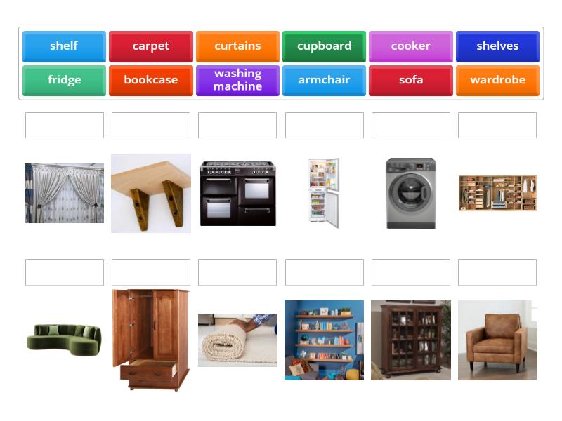 armchair, cooker, fridge, sofa, bookcase, cupboard, wardrobe, carpet, curtains, shelf, shelves, washing machine,