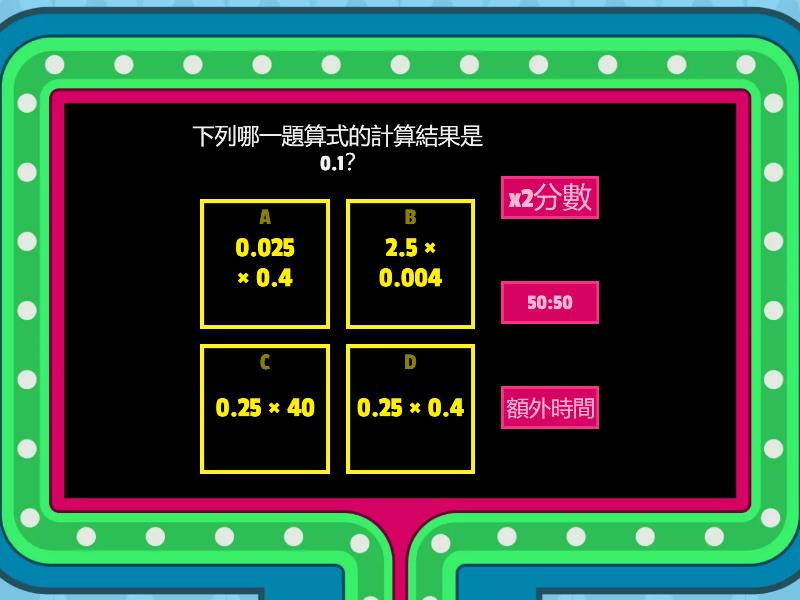 1) 下列哪一題算式的計算結果是 0.1? a) 0.025 × 0.4 b) 2.5 × 0.004 c) 0.25 × 40 d) 0.25 × 0.4 2) 下列哪一條算式的答案與其他不同? a) 5.8✖0.1 b) 58✖0.01 c) 5.8✖10 d) 0.0058✖100 3) 以下哪一題算式的結果與 2.07 × 0.1 的相同? a) 20.7 × 10 b) 0.207 × 1 c) 0.207 × 100 d) 2.07 × 1000 4) 下列哪一條算式的答以下哪一道算式的結果與0.45✖2.39不相同? a) 0.045✖23.9 b) 4.5✖0.239 c) 4.5✖23.9 d) 45✖0.0239 5) 以下哪一道算式的結果與1.26✖0.14相同? a) 1.26✖1.4 b) 12.6✖0.14 c) 12.6✖0.014 d) 12.6✖1.4 6) 下列哪一題算式的計算結果是 0.33? a) 0.66 × 5 b) 0.66 × 0.5 c) 0.66 × 0.05 d) 6.6 × 0.5