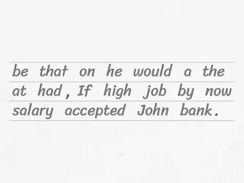 If John had accepted that job at the bank, he would be on a high salary by now., Sarah wouldn’t be at this school now if her parents hadn’t moved to this town two years ago., If I didn’t like meat, I wouldn’t have ordered it from the menu last night., If Tom hadn’t lost his iPad, he wouldn’t be looking miserable., If Alan hadn’t been rude to Ann, she would like him., If I liked animated films, I would have watched Cinderella., If the television had not broken, we would watch the game this weekend., If the Browns weren’t on holiday, they would have visited their neighbours., If I had learnt to play the violin, I would be in an orchestra now., If Kate wasn’t learning Portuguese, she wouldn’t have spent two weeks in Lisbon., If Jeremy was/were fit, he would have finished the race., If Paul didn’t believe you, he would have left you.,