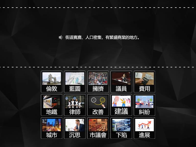 城市 - 街道寬廣、人口密集,有繁盛商業的地方。, 倫敦 - 城市名,是英國的首都。, 進展 - 進步發展。, 糾紛 - 有爭執的事情。, 律師 - 協助人進行訴訟、辯護或處理有關法律事務的人員。, 改善 - 改變舊有的情況,使其變好。, 擁擠 - 人、物眾多密集的樣子。, 藍圖 - 預先計畫或規畫、製定圖樣。, 市議會 - 市級地方民意機關。, 議員 - 由人民選出,可以代表人民行使政權的人。, 費用 - 開支、花費的款項。, 建議 - 意見、辦法。, 地鐵 - 地下鐵路。, 下陷 - 向下陷落。, 沉思 - 努力、深入的思考。,