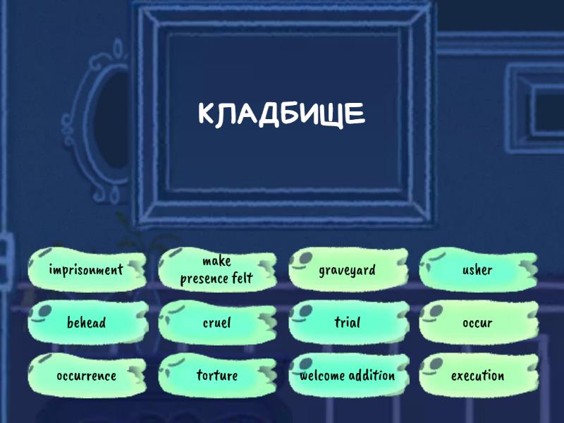 graveyard - КЛАДБИЩЕ, cruel - ЖЕСТОКИЙ, imprisonment - ЗАКЛЮЧЕНИЕ В ТЮРЬМУ, trial - СУД, execution - КАЗНЬ, torture - ПЫТКА, occurrence - ПОЯВЛЕНИЕ, behead - ОТРУБИТЬ ГОЛОВУ, occur - ПОЯВЛЯТЬСЯ, usher - БИЛЕТЕР, make presence felt - ДЕЛАТЬ ПРИСУТСТВИЕ ОЩУТИМЫМ, welcome addition - ПРИЯТНОЕ ДОПОЛНЕНИЕ,