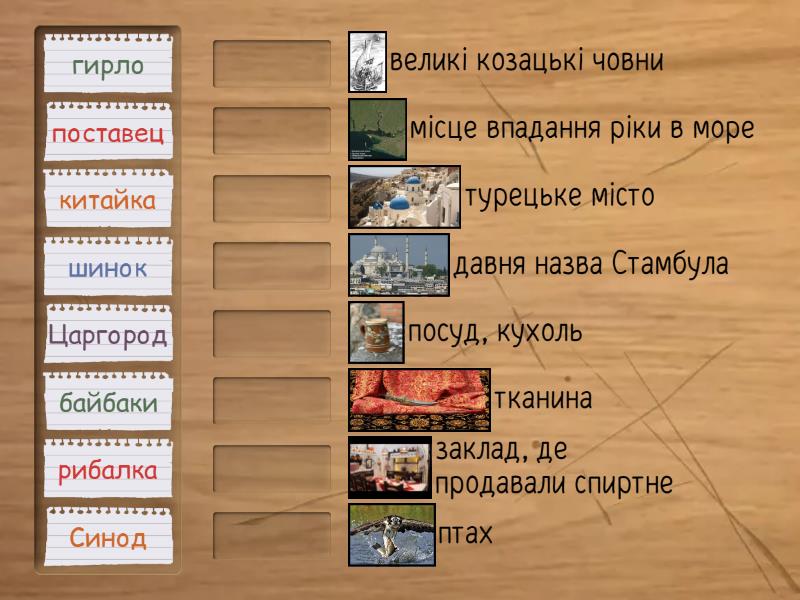 китайка - тканина, шинок - заклад, де продавали спиртне, поставец - посуд, кухоль, гирло - місце впадання ріки в море, байбаки - великі козацькі човни, рибалка - птах, Синод - турецьке місто, Царгород - давня назва Стамбула,
