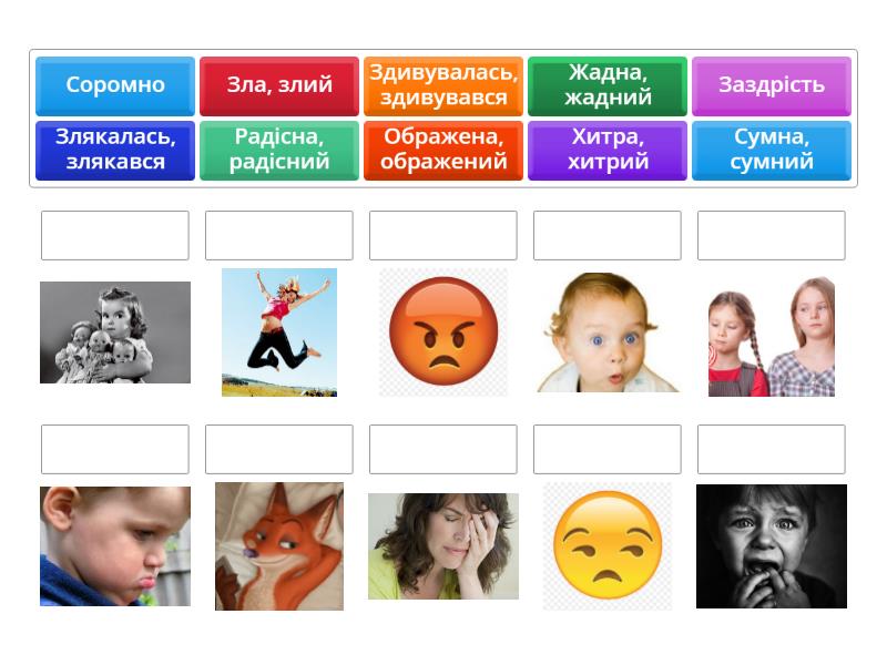 Радісна, радісний, Сумна, сумний, Хитра, хитрий, Заздрість, Ображена, ображений, Зла, злий, Соромно, Жадна, жадний, Злякалась, злякався, Здивувалась, здивувався,