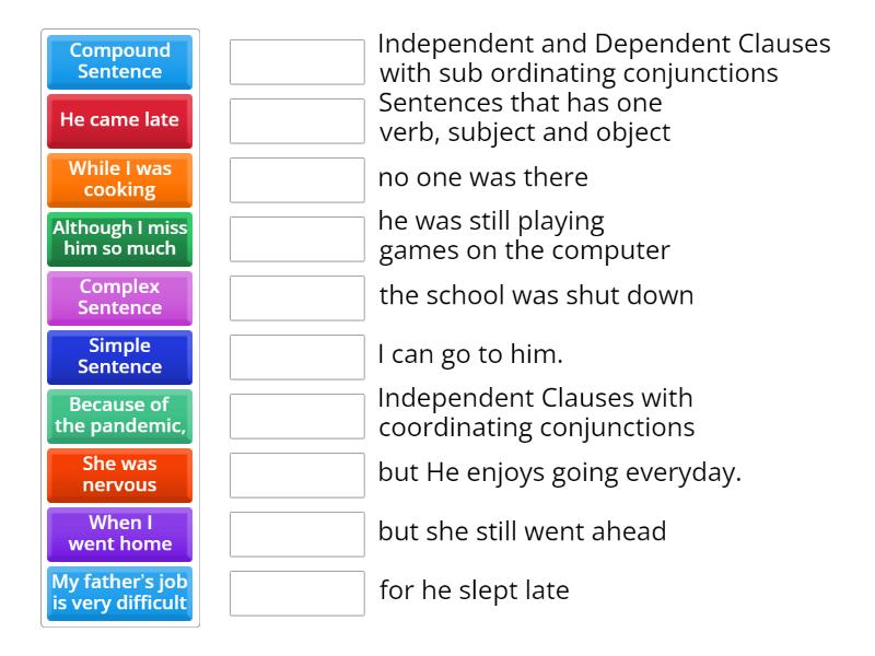 Simple Sentence - Sentences that has one verb, subject and object , Compound Sentence - Independent Clauses with coordinating conjunctions , Complex Sentence - Independent and Dependent Clauses with sub ordinating conjunctions , My father’s job is very difficult - but He enjoys going everyday., He came late - for he slept late , She was nervous - but she still went ahead , When I went home - no one was there , Because of the pandemic, - the school was shut down, While I was cooking - he was still playing games on the computer , Although I miss him so much - I can go to him.,