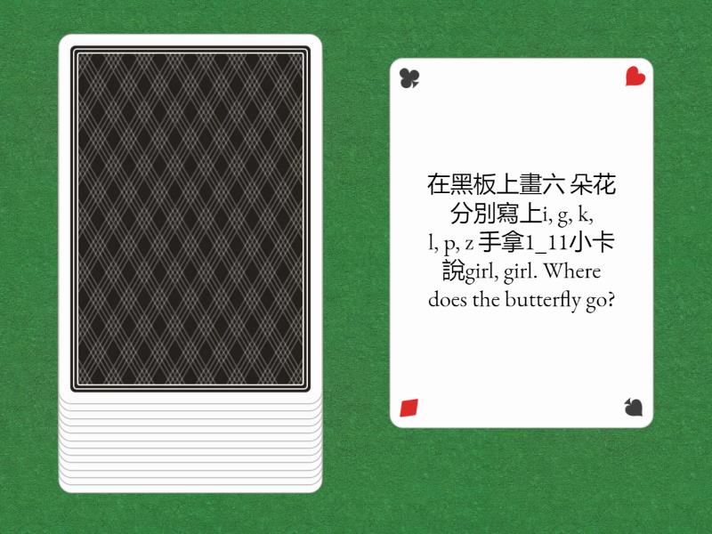 教師說出2個同字首音的單字 請學生說出這兩個字的字首音, 在黑板上寫出這兩個字 學生指出代表字首音的字母, 在黑板上畫六 朵花 分別寫上i, g, k, l, p, z 手拿1_11小卡 說k, k. Where does the bee go?, 在黑板上畫六 朵花 分別寫上i, g, k, l, p, z 手拿1_11小卡 說girl, girl. Where does the butterfly go?, 教師在黑板上畫五棵樹 分別寫上id, ig, in, ip, it 手拿只有寫數 字1~11的小卡片 ip, ip. Where does the bird go?, 教師在黑板上畫五棵樹 分別寫上id, ig, in, ip, it 手上拿著只有寫數 字1~9的小卡片 pin, pin. Where does the squirrel go?, 教師在黑板上寫出字母i, g, k, l, p, z 第一次練習,由教師擲 , 教師在黑板上寫出字母g, k, l, p, z 教師手上的球則寫出或貼出i 由教師擲, 教師在黑板上寫出韻腳id, ig, in, ip, it 第一次練習,由教師擲, 教師在黑板上寫出 或貼出韻腳id, ig, in, ip, it,教師手上的球則寫出 或貼出k。第一次練習,由教師擲, 卡片 寫出字母i, d, g, k, l, n, p, w, z 帶領指讀 Show me “i-.學生推卡 ” Show me “i-d.”, 卡片Show me “-id.”推出Showme“kid.”, Blending。T: “k-,” “-id.” Ss: “kid.” kid, pin, pig, wig,lip, zip , Segmentation。 T: “kid.” Ss: “k-,” “-id.” kid, pin, pig, wig,lip, zip.