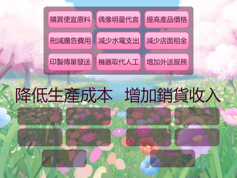 降低生產成本: 刪減廣告費用, 購買便宜原料, 減少水電支出, 減少店面租金, 機器取代人工, 增加銷貨收入: 提高產品價格, 增加外送服務, 偶像明星代言, 印製傳單發送,