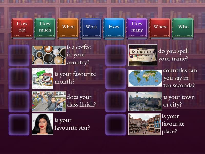 What - is your favourite month?, How - do you spell your name?, How many - countries can you say in ten seconds?, Where - is your favourite place?, How much - is a coffee in your country?, When - does your class finish?, Who - is your favourite star?, How old - is your town or city?,