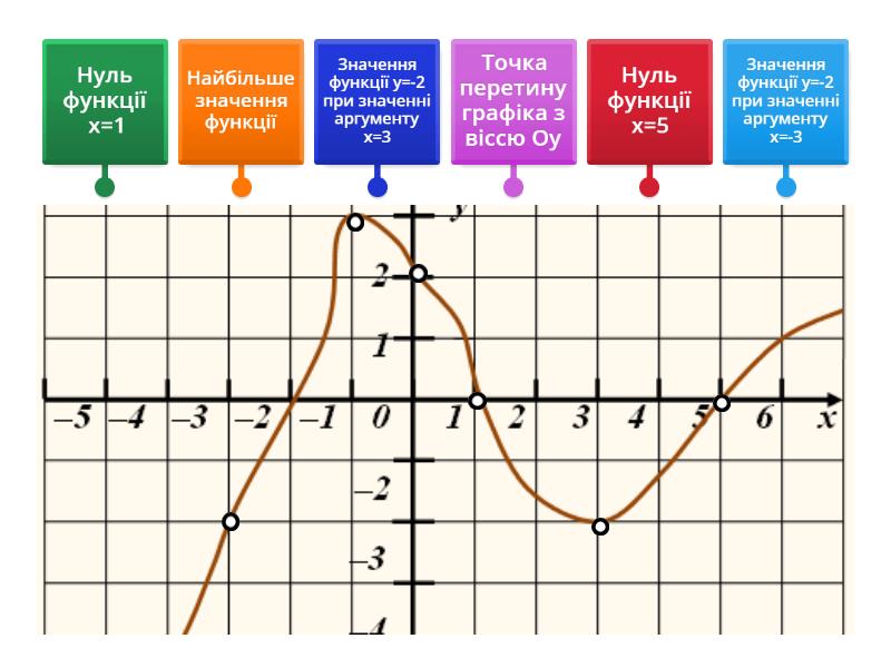 Значення функції у=-2 при значенні аргументу х=-3, Нуль функції х=5, Найбільше значення функції , Нуль функції х=1, Точка перетину графіка з віссю Оу , Значення функції у=-2 при значенні аргументу х=3.