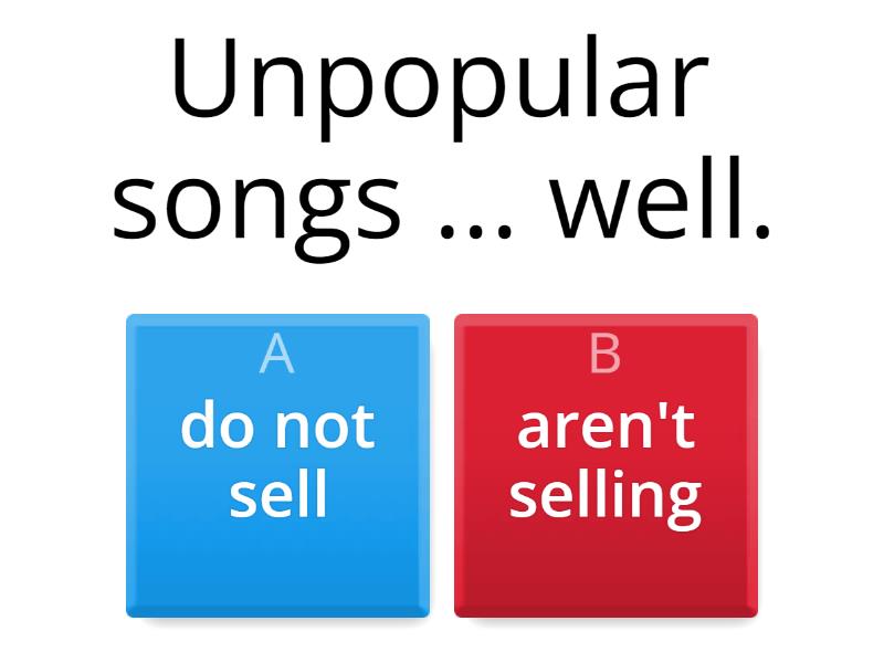 1) Unpopular songs ... well. a) do not sell b) aren't selling 2) I ... a hat today because it's so hot and sunny. a) 'm wearing b) wear 3) The sun .... today. a) is shining b) shines 4) We usually ... to the park in the afternoon but today we ... shopping a) are going - go b) go - are going 5) Dad ... the car in the garage right now. a) washes b) is washing 6) My older brother ... in London. a) is living b) lives 7) The sun always .. in the east. a) rises b) is rising 8) Bill usually .... to work at 8.00 am. a) is going b) goes 9) I think I'll have a sandwich because I ... hungry. a) am b) is 10) Jake ... a history book at the moment. a) reads b) is reading