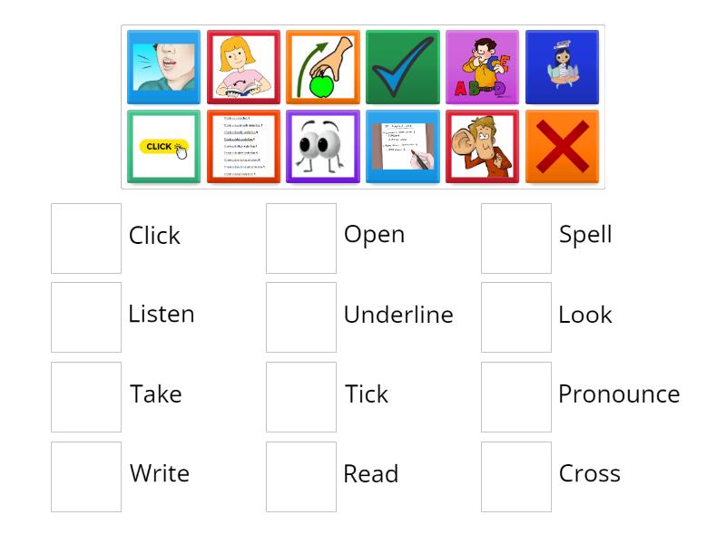 Read, Write, Tick, Cross, Underline, Listen, Look , Pronounce , Open , Click , Take , Spell ,