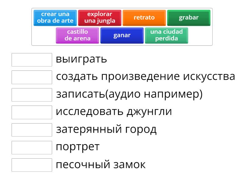 castillo de arena - песочный замок, retrato - портрет, explorar una jungla - исследовать джунгли, ganar - выиграть, crear una obra de arte - создать произведение искусства, una ciudad perdida - затерянный город, grabar - записать(аудио например),