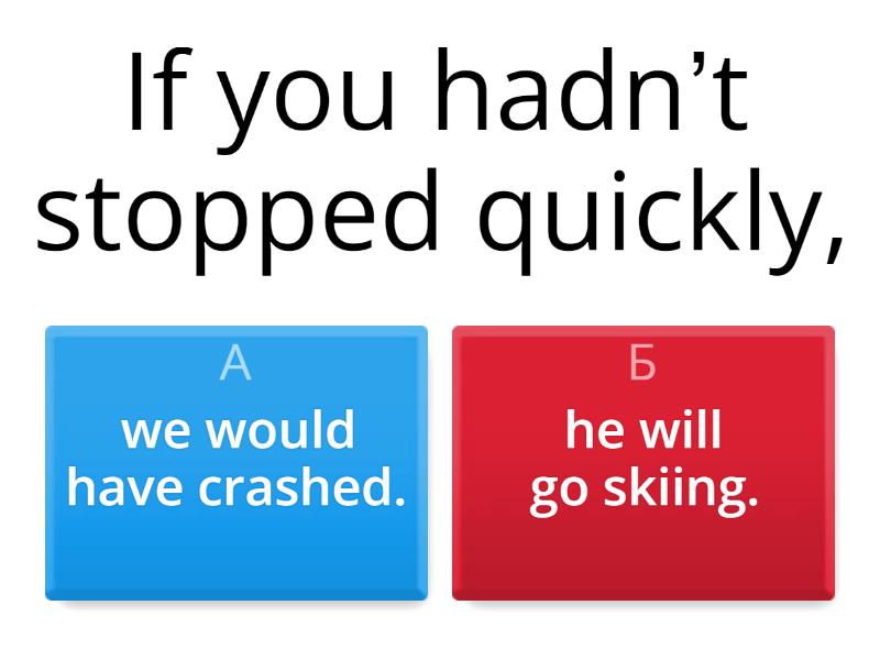 1) If you hadn’t stopped quickly, a) we would have crashed. b) he will go skiing. 2) I wouldn’t have gone to the party a) I will play with my kite. b) if you hadn’t persuaded me to go. 3) If I’d studied harder, a) I probably would’ve passed the exam. b) they will go to have a swim. 4) If he had worked better, a) he wouldn't have been dismissed b) I will buy some food. c) .