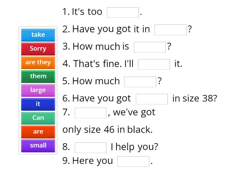 1. It's too ____. 2. Have you got it in ____? 3. How much is ____? 4. That's fine. I'll ____ it. 5. How much ____? 6. Have you got ____ in size 38? 7. ____, we’ve got only size 46 in black. 8. ____ I help you? 9. Here you ____.