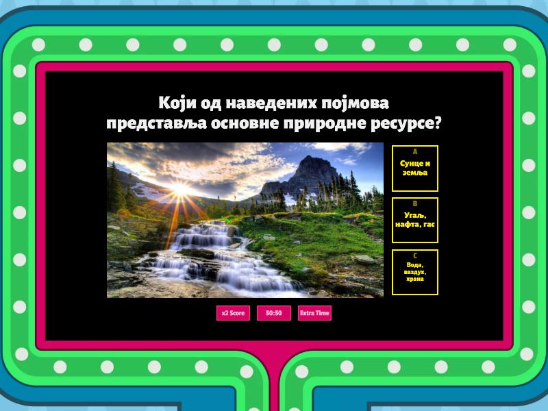1) Који од наведених појмова представља основне природне ресурсе? a) Сунце и земља b) Угаљ, нафта, гас c) Вода, ваздух, храна 2) Избаци уљеза: a) Угаљ b) Кисеоник c) Минерали d) Нафта e) Мермер f) Земни гас 3) Који вид енергије је приказан на слици? a) Енергија воде b) Енергија Сунца c) Геотермална енергија d) Нуклеарна енергија e) Еолска енергија 4) Дрво је необновљив ресурс, али се третира као обновљив ресурс. a) Тачно b) Нетачно 5) Да ли мини-хидроелектране наносе штету животној средини? a) Да b) Не 6) Шта подразумева одрживи развој? a) Неравнотежа између узимања и обнављања. b) Равнотежа између узимања и обнављања. c) Више се узима него што се обнавља. d) Више се обнавља него што се узима. 7) Да ли се у корисне површине убрајају пустиње ? a) Да b) Не 8) Која земља предњачи у коришћењу обновљиве енeргије? a) Норвешка b) Бразил c) Канада 9) Колико Циљева одрживог развоја постоје? a) 7 b) 17 c) 26 d) 27 e) 28 f) 29 10) Који је крајњи рок за испуњење свих Циљева одрживог развоја? a) 2025. b) 2027. c) 2028. d) 2030. e) 2047.