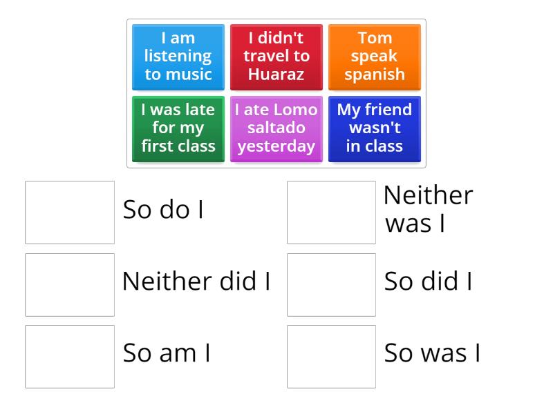 I didn't travel to Huaraz - Neither did I, Tom speak spanish - So do I, I was late for my first class - So was I, I am listening to music - So am I, My friend wasn't in class - Neither was I, I ate Lomo saltado yesterday - So did I,