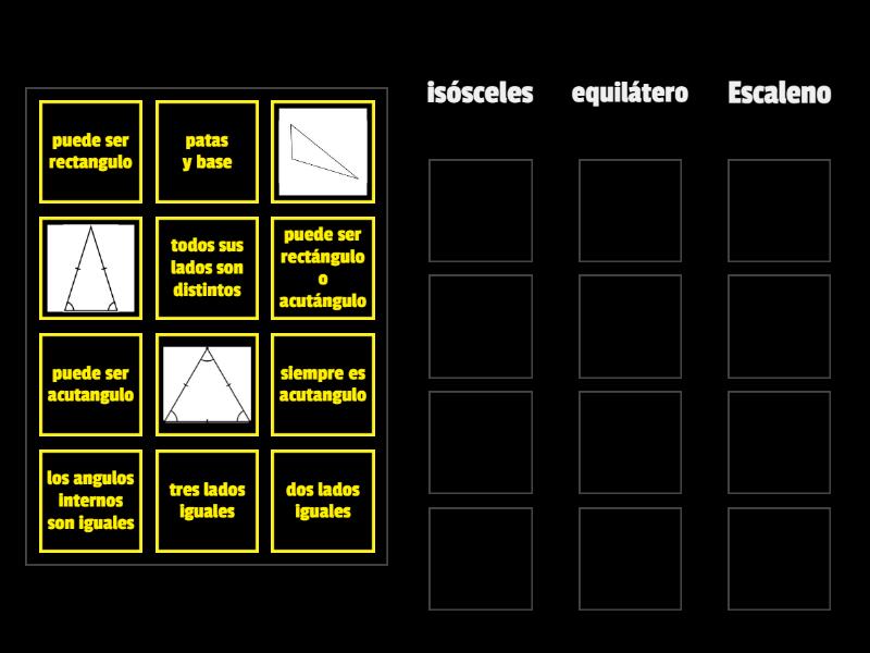 isósceles: puede ser rectángulo o acutángulo, dos lados iguales, patas y base, , equilátero: siempre es acutangulo, tres lados iguales, los angulos internos son iguales, , Escaleno: puede ser acutangulo, puede ser rectangulo, todos sus lados son distintos, ,