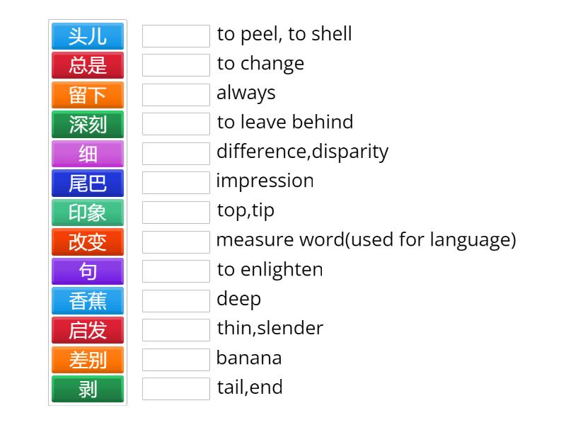 句 - measure word(used for language), 留下 - to leave behind, 深刻 - deep, 印象 - impression, 香蕉 - banana, 总是 - always, 尾巴 - tail,end, 剥 - to peel, to shell, 细 - thin,slender, 头儿 - top,tip, 差别 - difference,disparity, 启发 - to enlighten, 改变 - to change,