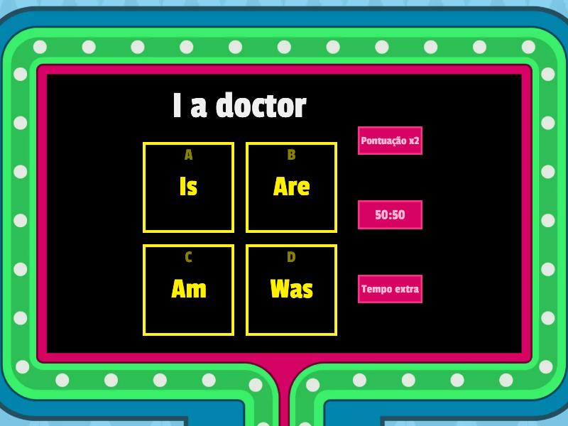 1) I a doctor a) Is b) Are c) Am d) Was 2) She not from Brazil a) Is b) Are c) Were d) Am 3) She loves a) Me b) Him c) He d) She 4) They love a) Him b) She c) Us d) Am 5) He loves very much a) She b) Her c) Am d) I 6) I like a) Them b) Us c) Are d) Was 7) Are his sister a) She b) You c) We d) They 8) I love and I adore a) Me and You b) Us and Them c) Me and Him d) Him and Her 9) Do go to cinema? a) I b) She c) We d) Are