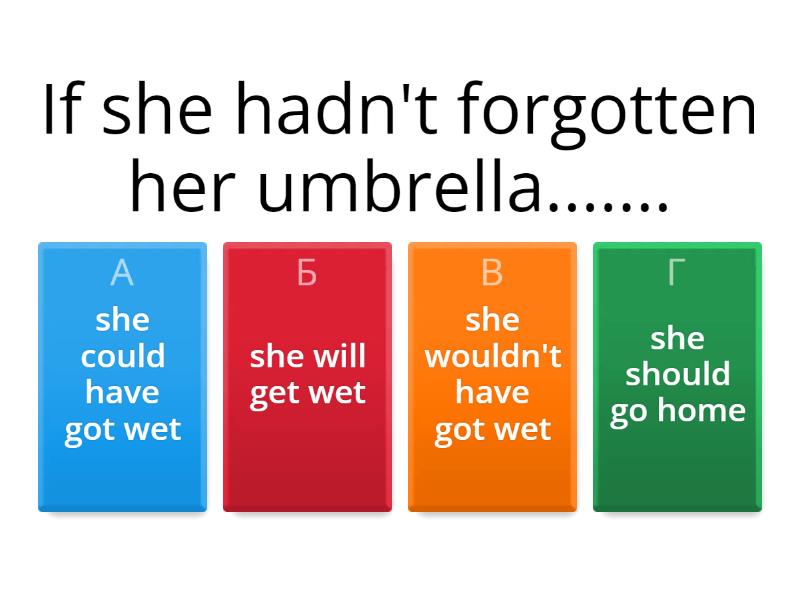 1) If she hadn't forgotten her umbrella....... a) she could have got wet b) she will get wet c) she wouldn't have got wet d) she should go home 2) If students had worked so hard...... a) they wouldn't have passed their exam b) they failed the exam c) they would have passed their exam d) they try to pass the exam 3) If I had gone to university...... a) I wouldn't have gotten a degree b) I would have gotten a degree c) I could have gone to the grocery d) I couldn't have bought a dress 4) If Julie had waited for Alex more.... a) she would have missed the plane b) she wouldn't have missed the plane c) she could have talked to the tourists d) might have had an accident