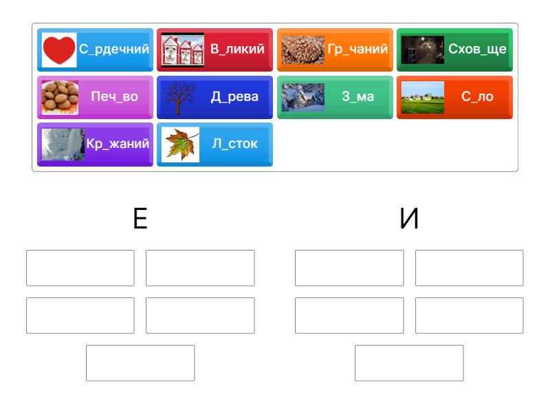 Е: С_ло, Гр_чаний, В_ликий, С_рдечний, Д_рева, И: Л_сток, Кр_жаний, Печ_во, З_ма, Схов_ще,