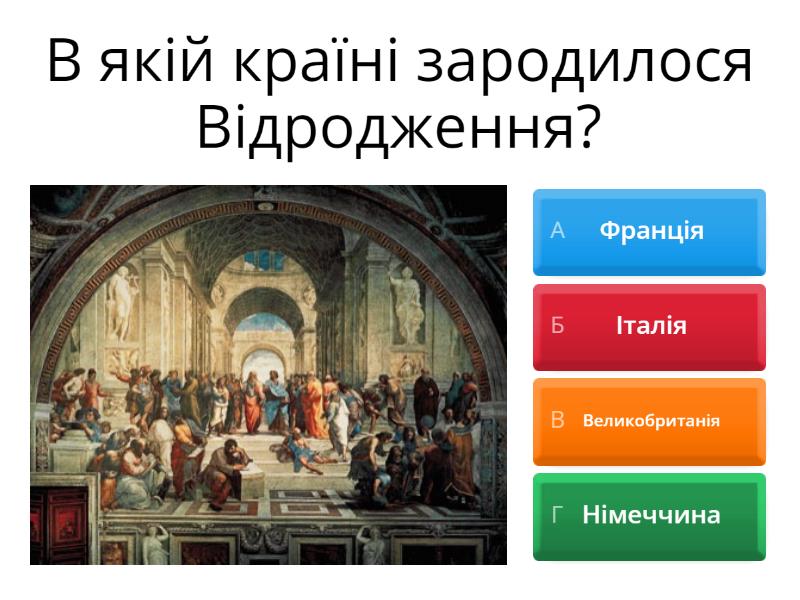 1) В якій країні зародилося Відродження? a) Франція b) Італія c) Великобританія d) Німеччина 2) Який аналог терміну "Відродження"? a) Ренесанс b) Рококо c) Готика d) Бароко 3) Хронологічні межі епохи Відродження такі: a) 13-16 століття b) 15-18 століття c) 16-19 століття d) 13-18 століття 4) Відродження характеризується зверненням до... a) Античності b) Доісторичних часів c) Інквізиції d) Первісного світу 5) Оберіть варіант, який НЕ притаманний гуманістам a) інтерес до людини b) інтерес до вивчення гуманітарних дисциплін c) дослідження людини такою, як вона є d) цікавість до релігії та церкви 6) Яскравим представником італійського гуманізму є a) Томас Мор b) Ульріх фон Гутен c) Франческо Петрарка d) Артем Макух 7) Франческо Петрарка написав збірку ліричних віршів-сонетів... a) "Книгу пісень" b) "Книгу молитов" c) "Книгу приказок" d) "Книгу правил"