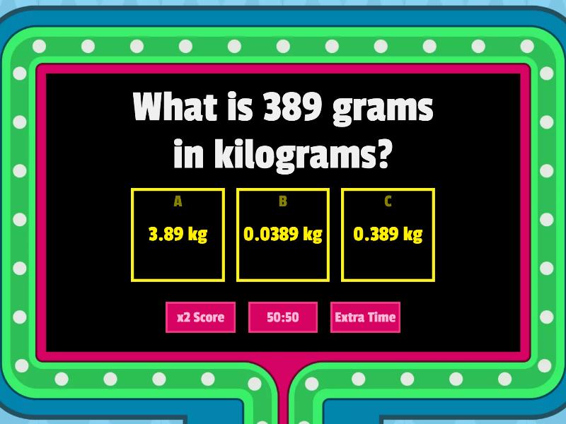 1) What is 389 grams in kilograms? a) 3.89 kg b) 0.0389 kg c) 0.389 kg 2) What is 6789 grams in kilograms? a) 6.789 kg b) 67.89 kg c) 0.6789 kg 3) What is 5.7 kilograms in grams? a) 570 g b) 5700 g c) 57,000 g 4) What is 13.746 kilograms in grams? a) 13,746 grams b) 1374.6 grams c) 137.46 grams 5) 2.14kg + 1560g + 3kg 460g = a) 6490g or 6.490 kg b) 7860g or 7.860kg c) 7160g or 7.160kg 6) 8.9kg - 1490g = a) 7410g or 7.41kg b) 7650g or 7.65kg c) 7141g or 7.141kg 7) Find the total weight of 7 boxes of apples if each box weighs 6kg 350g. a) 47,878g or 47.878kg b) 45,000g or 45kg c) 44,450g or 44.45kg 8) If a box of cornflakes holds 750g, how many bowls of 30g can you get from one box? a) 25 b) 26 c) 35 9) A tin of peas weighs 345g. How heavy would 92 of these tins be? a) 31,740g b) 32,740g c) 31,745g