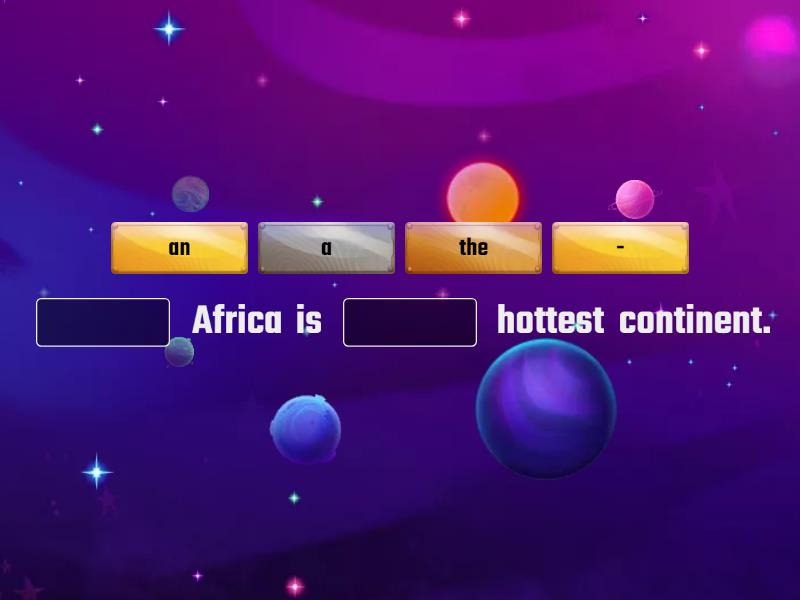 ____ Africa is ____ hottest continent. China is in ____ Asia. ____ Nile is the longest river. ____ Minsk is ____ capital of Belarus ____ Australia is in ____ Indian ocean. ____ biggest lake is our planet is ____ Lake Baikal. I've never seen ____ Atlantic Ocean. ____ Neman river is in ____ Belarus. He visited ____ USA last year. He lives in ____ Lenina Street. ____ UK is in Europe. ____ Lake Naroch is the biggest lake in - Belarus
