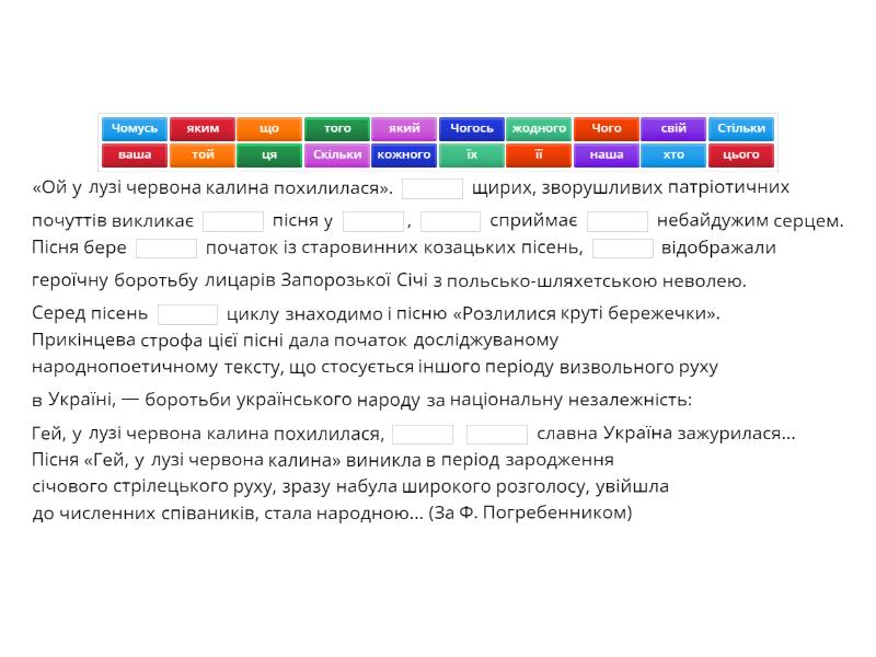 «Ой у лузі червона калина похилилася». ____ щирих, зворушливих патріотичних почуттів викликає ____ пісня у ____, ____ сприймає ____ небайдужим серцем. Пісня бере ____ початок із старовинних козацьких пісень, ____ відображали героїчну боротьбу лицарів Запорозької Січі з польсько-шляхетською неволею. Серед пісень ____ циклу знаходимо і пісню «Розлилися круті бережечки». Прикінцева строфа цієї пісні дала початок досліджуваному народнопоетичному тексту, що стосується іншого періоду визвольного руху в Україні, — боротьби українського народу за національну незалежність: Гей, у лузі червона калина похилилася, ____ ____ славна Україна зажурилася... Пісня «Гей, у лузі червона калина» виникла в період зародження січового стрілецького руху, зразу набула широкого розголосу, увійшла до численних співаників, стала народною... (За Ф. Погребенником)
