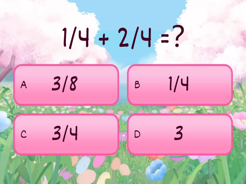 1) 1/4 + 2/4 =? a) 3/8 b) 1/4 c) 3/4 d) 3 2) 1/5 + 3/5 = ? a) 4/5 b) 2/5 c) 4/10 d) 4 3) 1/6+1/6=? a) 2/12 b) 2/6 c) 7/7 d) 2