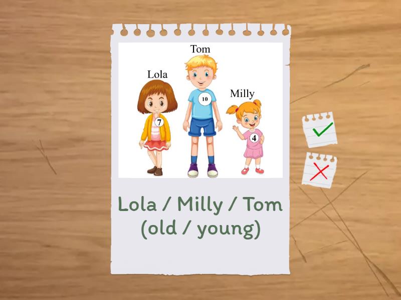 Milly / Lola / Tom (young) - Milly is younger than Lola and younger than Tom., Tom / Lola / Milly (old) - Tom is older than Lola and Milly., Milly / Tom / Lola (short) - Milly is shorter than Tom and shorter than Lola., Tom / Lola / Milly (tall) - Tom is taller than Lola and taller than Milly., Lola / Tom / Milly (short / tall) - Lola is shorter than Tom and taller than Milly., Lola / Milly / Tom (old / young) - Lola is older than Milly and younger than Tom., Lola / Milly / Tom (tall / short) - Lola is taller than Milly and shorter than Tom., Lola / Milly / Tom (young / old) - Lola is younger than Tom and older than Milly.,