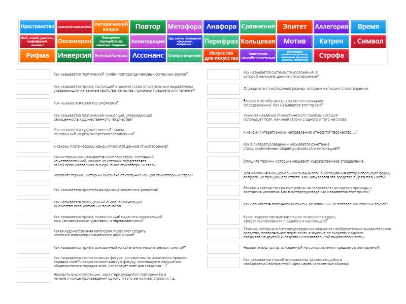 Инверсия - Как называется стилистическая фигура, основанная на изменении прямого порядка слов?// Какую стилистическую фигуру, состоящую в нарушении общепринятого порядка слов, использует поэт для создания …?, Метафора - Термин, которым в литературоведении называют изобразительно-выразительное средство, позволяющее переносить значение по сходству с одного предмета на другой? (Средство иносказательной выразительности). , Анафора - Укажите название стилистического приёма, который использует поэт, начиная строки с одного и того же слова. , Кольцевая, перекрёстная, смежная <парная> - Как называется характер рифмовки? , Ода, элегия, посвящение <послание>, эпиграмма… - К какому поэтическому жанру относится данное стихотворение?, Ассонанс - Как называется поэтический приём, основанный на повторении гласных звуков? , Аллитерация - Как называется поэтический приём повтора одинаковых согласных звуков?, Ямб, хорей, дактиль, амфибрахий, анапест - Определите стихотворный размер, которым написано стихотворение., Эпитет - Впишите термин, которым называют художественное определение. , Олицетворение - Как называется приём, позволяющий наделить окружающий мир человеческими чувствами и переживаниями? , Тоническая, силлабо-тоническая - Как называется система стихосложения, в которой написано данное стихотворение?, Строфа - Как в литературоведении называется сочетание строк, скрепленных общей рифмовкой и интонацией? , Рифма - Назовите термин, которым обозначают созвучие концов стихотворных строк?, Оксюморон - Как называется приём, основанный на сочетании несочетаемых понятий? , Сравнение - Назовите вид тропа, основанный на сопоставлении предметов или явлений. , Мотив - Как называется простейшая единица сюжетного развития? , Катрен - Каким термином называется комплекс строк, состоящий из четверостиший, каждое из которых представляет собой организованное объединение стихотворных строк. , Аллегория - Как называется способ иносказания, заключающийся в изображении абстрактной идеи через конкретные образы? , . Символ - Как называется обобщенный образ, включающий множество ассоциативных признаков. , Время - Какая художественная категория позволяет создать эффект «сопряжения» прошлого и настоящего? , Перифраз - Как называется приём, состоящий в замене слова описательным выражением, указывающим на важные свойства, качества, признаки предмета или явления? , Риторический вопрос - Для усиления эмоциональной значимости высказывания автор использует форму вопроса, не требующего ответа. Как называется это средство выразительности? , Кольцевая - Назовите вид композиции, характеризующийся повторением в начале и конце произведения одного и того же мотива, строки и т.д. , Классицизм, романтизм, реализм, символизм, футуризм, акмеизм, имажинизм - К какому литературному направлению относится творчество…?, Антитеза//контраст - Как называется художественный прием, основанный на резком противопоставлении?, Сравнение//Параллелизм - Вторая и третья строфа построены на сопоставлении картин природы и состояния человека. Как в литературоведении называется этот приём?, Повтор - Вторая и четвёртая строфы почти совпадают по содержанию. Как называется этот прием? , Пространство - Какая художественная категория позволяет создать иллюзию взаимопроницаемости двух миров? , Иск