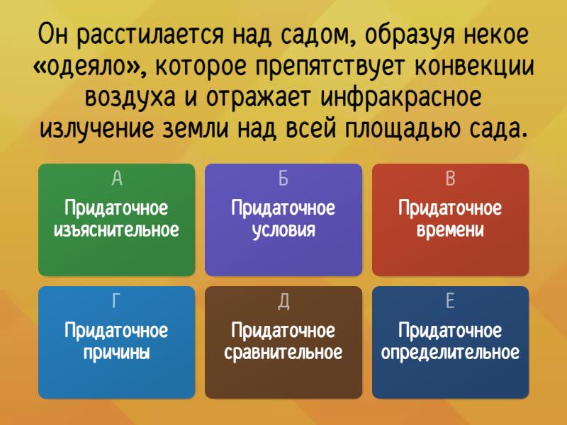 1) Он расстилается над садом, образуя некое «одеяло», которое препятствует конвекции воздуха и отражает инфракрасное излучение земли над всей площадью сада. a) Придаточное изъяснительное b) Придаточное условия c) Придаточное времени d) Придаточное причины e) Придаточное сравнительное f) Придаточное определительное 2) Общепринятое положение о единых для человека и животных закономерностях эволюции мозга позволяет считать, что эмоции сформировались задолго до появления человека. a) Придаточное изъяснительное b) Придаточное условия c) Придаточное времени d) Придаточное причины e) Придаточное сравнительное f) Придаточное определительное 3) Окружающая среда, в которой существуют живые организмы, постоянно меняется. a) Придаточное изъяснительное b) Придаточное условия c) Придаточное времени d) Придаточное причины e) Придаточное сравнительное f) Придаточное определительное 4) Приём и отображение графических сообщений возможны, если телефон поддерживает такую функцию. a) Придаточное изъяснительное b) Придаточное условия c) Придаточное времени d) Придаточное причины e) Придаточное сравнительное f) Придаточное определительное 5) Более 80 % информации об окружающем нас мире мы получаем с помощью зрения, воспринимая глазами свет, который излучают или отражают окружающие нас предметы. a) Придаточное изъяснительное b) Придаточное условия c) Придаточное времени d) Придаточное причины e) Придаточное сравнительное f) Придаточное определительное 6) Они страдают так мучительно, что читать об этих страданиях больно. a) Придаточное изъяснительное b) Придаточное условия c) Придаточное времени d) Придаточное причины e) Придаточное образа действия, меры и степени f) Придаточное определительное 7) В результате возникает огромная масса обломков, которая постепенно перемещается по планете в направлении наиболее низких её участков. a) Придаточное изъяснительное b) Придаточное условия c) Придаточное времени d) Придаточное причины e) Придаточное сравнительное f) Придаточное определительное 8) Когда же решили венчать Мономаховой шапкой на царство, её превратили в корону. a) Придаточное изъяснительное b) Придаточное условия c) Придаточное времени d) Придаточное причины e) Придаточное образа действия, меры и степени f) Придаточное определительное 9) В его эскизах представлены весьма сложные и разнообразные варианты зубчатых передач, которые до сих пор применяются в недорогих устройствах, например в механических будильниках. a) Придаточное изъяснительное b) Придаточное условия c) Придаточное времени d) Придаточное причины e) Придаточное сравнительное f) Придаточное определительное 10) Земля – третья планета Солнечной системы, это единственная пока известная нам планета, на которой есть жизнь. a) Придаточное изъяснительное b) Придаточное условия c) Придаточное времени d) Придаточное причины e) Придаточное сравнительное f) Придаточное определительное 11) До сих пор даже неясно, обладает ли морская мышь цветовым зрением. a) Придаточное изъяснительное b) Придаточное условия c) Придаточное времени d) Придаточное причины e) Придаточное сравнительное f) Придаточное определительное 12) Двенадцать получается, если, например, начать с нижней фаланги указательного пальца и закончить верхней фалангой мизинца. a) Придаточное изъяснительное b) Придаточное условия c) Придаточное времени d) Придат