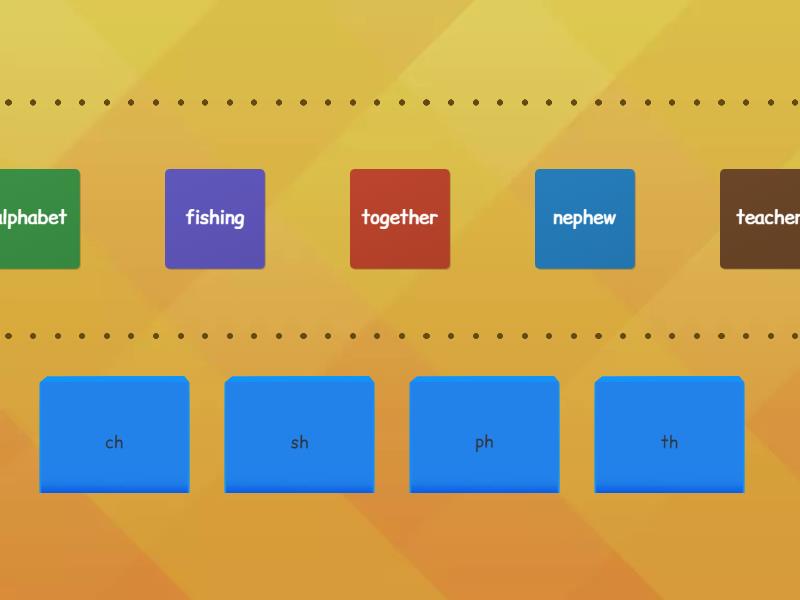 ch: kitchen, teacher, inches, lunchtime, ketchup, pitcher, sh: milkshake, cushion, wishes, mushroom, fishing, sunshine, ph: elephant, nephew, trophy, alphabet, gopher, dolphin, th: father, mother, together, another, other, without,