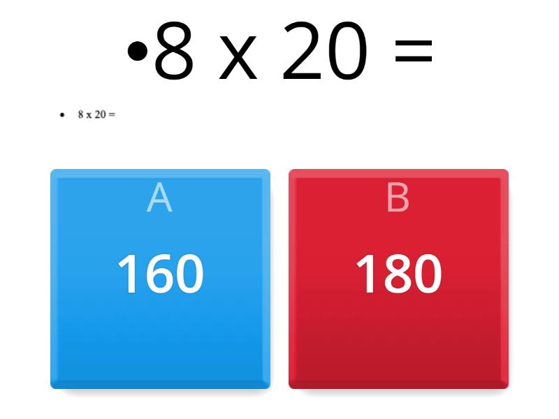 1) •8 x 20 = a) 160 b) 180 2) •3 x 70 = a) 210 b) 530 3) 8x80= a) 650 b) 640 4) 7x60= a) 420 b) 430 5) 6x90= a) 150 b) 960