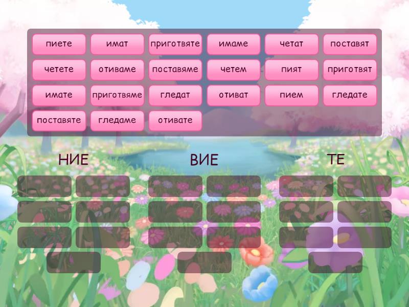 НИЕ: четем, имаме, отиваме, гледаме, пием, приготвяме, поставяме, ВИЕ: четете, имате, отивате, гледате, пиете, приготвяте, поставяте, ТЕ: четат, имат, отиват, гледат, пият, приготвят, поставят,