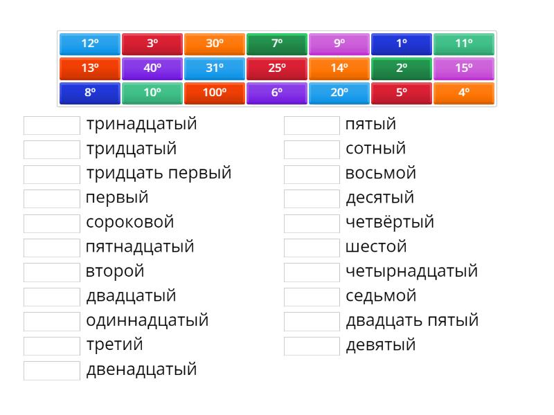 1º - первый, 2º - второй, 3º - третий, 4º - четвёртый, 5º - пятый, 6º - шестой, 7º - седьмой, 8º - восьмой, 9º - девятый, 10º - десятый, 11º - одиннадцатый, 12º - двенадцатый, 13º - тринадцатый, 14º - четырнадцатый, 15º - пятнадцатый, 20º - двадцатый, 25º - двадцать пятый, 30º - тридцатый, 31º - тридцать первый, 40º - сороковой, 100º - сотный,