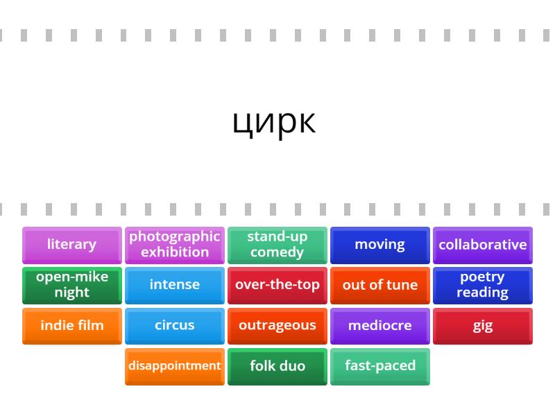 circus - цирк , gig - концерт , indie film - авторский фильм , open-mike night - открытый микрофон , photographic exhibition - фото выставка , poetry reading - вечер поэзии, stand-up comedy - комик , out of tune - не настроенный (про муз инструмент) , mediocre - средненький по качеству , intense - насыщенный, интенсивный , over-the-top - чрезмерно наигранный , disappointment - разочарование , folk duo - народный дуэт , literary - литературный , moving - трогательный , fast-paced - быстро развивающийся , outrageous - вызывающий, на грани фола , collaborative - совместный ,