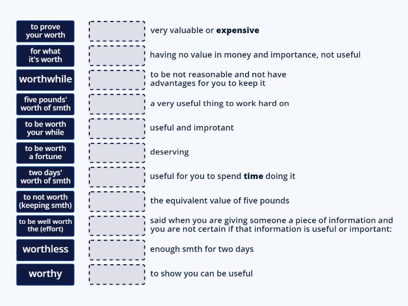to be worth a fortune - very valuable or expensive, worthless - having no value in money and importance, not useful, to not worth (keeping smth) - to be not reasonable and not have advantages for you to keep it, to be well worth the (effort) - a very useful thing to work hard on, worthwhile - useful and improtant, worthy - deserving, to be worth your while - useful for you to spend time doing it, five pounds' worth of smth - the equivalent value of five pounds, for what it's worth - said when you are giving someone a piece of information and you are not certain if that information is useful or important:, two days' worth of smth - enough smth for two days, to prove your worth - to show you can be useful,