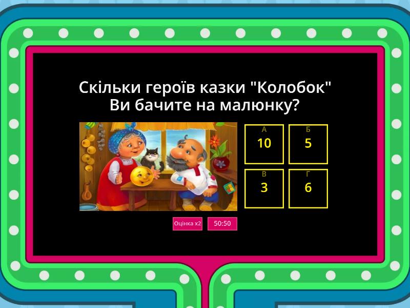 1) Скільки героїв казки "Колобок" Ви бачите на малюнку? a) 10 b) 5 c) 3 d) 6 2) Скільки героїв мультфільму "Льодовиковий період" Ви бачите на малюнку? a) 5 b) 1 c) 9 d) 4 3) Скільки героїв мультфільму "Суперсімейка" Ви бачите на малюнку? a) 9 b) 6 c) 5 d) 8 4) Скільки героїв казки "Рукавичка" Ви бачите на малюнку? a) 1 b) 9 c) 4 d) 5 5) Скільки героїв мультфільму "Панда КунФу" Ви бачите на малюнку? a) 7 b) 8 c) 6 d) 10 6) Скільки героїв мультфільму "Мадагаскар" Ви бачите на малюнку? a) 1 b) 4 c) 5 d) 6 7) Скільки гномів Ви бачите на малюнку? a) 1 b) 7 c) 5 d) 6 8) Скільки героїв мультфільму "Шрек" ви бачите на малюнку? a) 2 b) 3 c) 4 d) 5