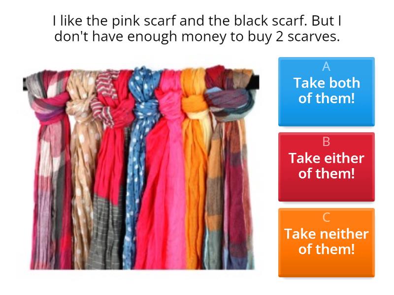 1) I like the pink scarf and the black scarf. But I don't have enough money to buy 2 scarves. a) Take both of them! b) Take either of them! c) Take neither of them! 2) Neither Polina ___ Uliana has a driving license. a) Or b) Nor c) And 3) Katherine wants to sleep and to bathe. a) She wants both to sleep and to bathe. b) She wants neither to sleep nor to bathe. c) She wants either to sleep or to bathe. 4) Kate doesn't eat milk and meat. a) She eats either milk or meat. b) She eats both milk and meat. c) She eats neither meat nor milk. 5) Diana and Jack love English. a) Either of them loves English. b) Both of them love English. c) Neither of them loves English. 6) I have 2 pens, but I need one now. a) You can take either. b) You can take neither. c) Take both. 7) Both Vika and Veronika are here. You can speak to... a) None of them b) Neither of them c) Either of them